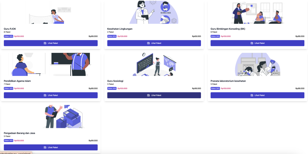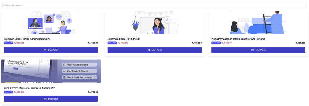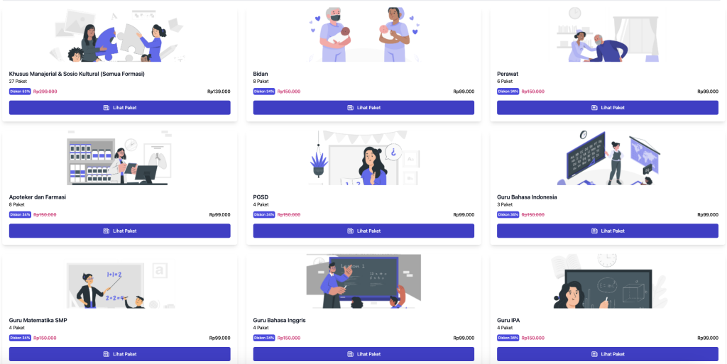 • Paket bimbel yang ada berfokus kepada formasi jabatan yang populer, terutama untuk Nakes dan Guru. Jabatan selain itu seperti teknis belum tersedia, bisa cek rekomendasi bimbel di nomor 2 dibawah.