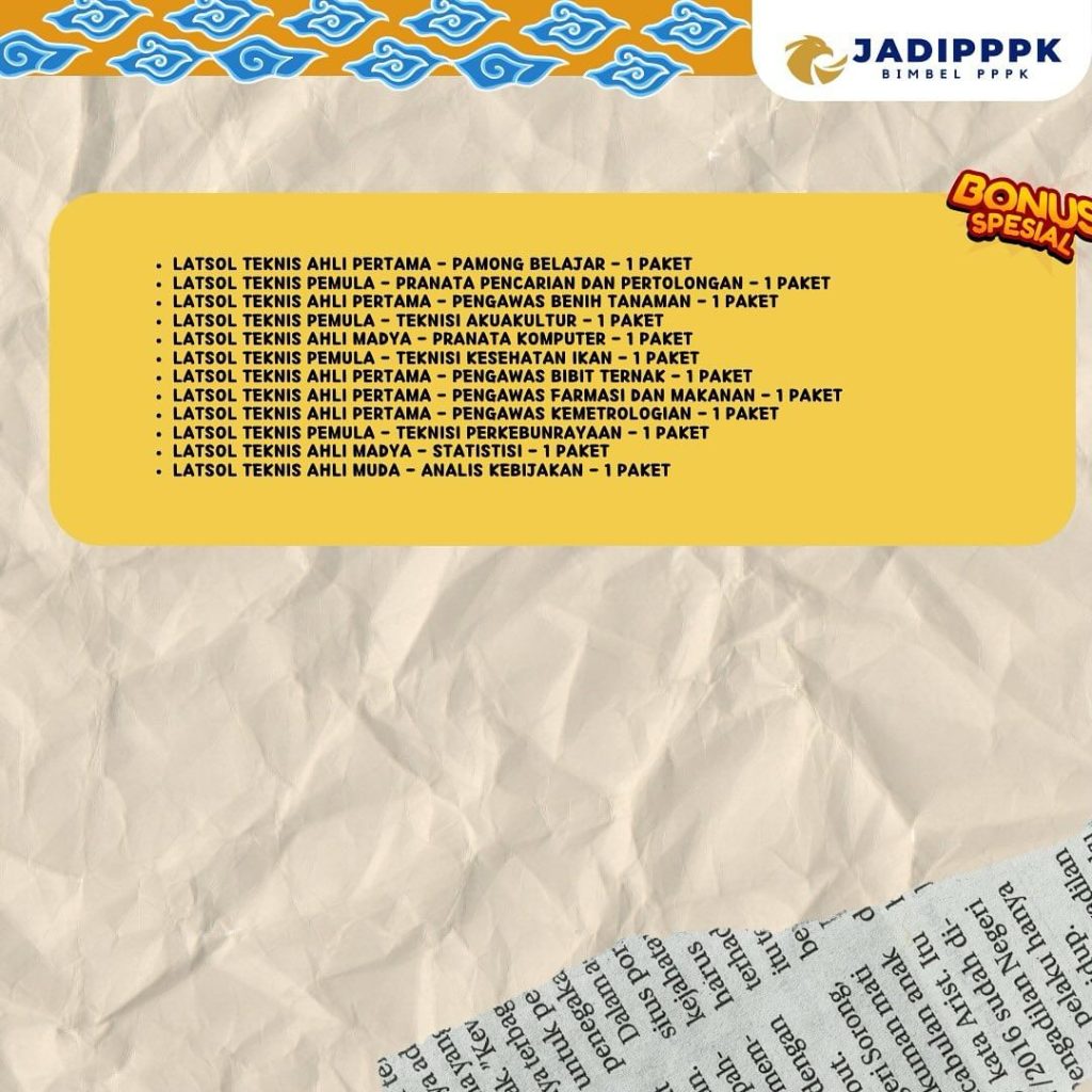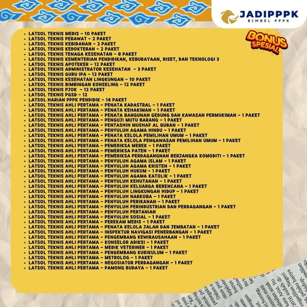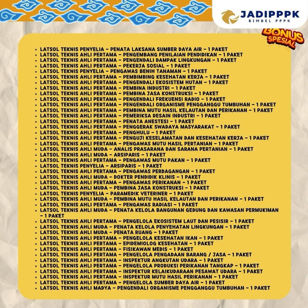 2. ditambah dengan latihan soal teknis untuk semua formasi jabatan yang tersedia (daftar formasi jabatan nya ada dibawah). Jadi gak spesifik beli untuk bimbel formasi tertentu seperti ayopppk